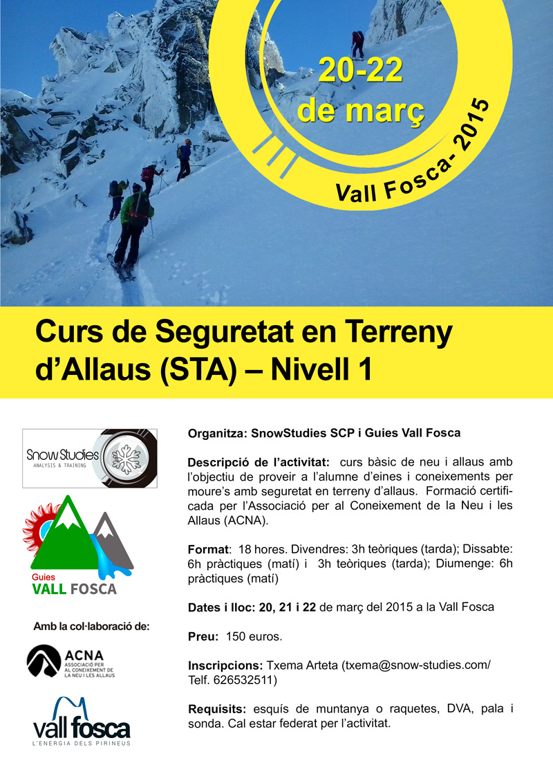 L’empresa de nivologia SnowStudies SCP amb seu al Pallars i l’empresa Guies Vall Fosca són els encarregats de portar a terme aquest curs formatiu que està avalat per l’Associació per al Coneixement de la Neu i les Allaus (ACNA).